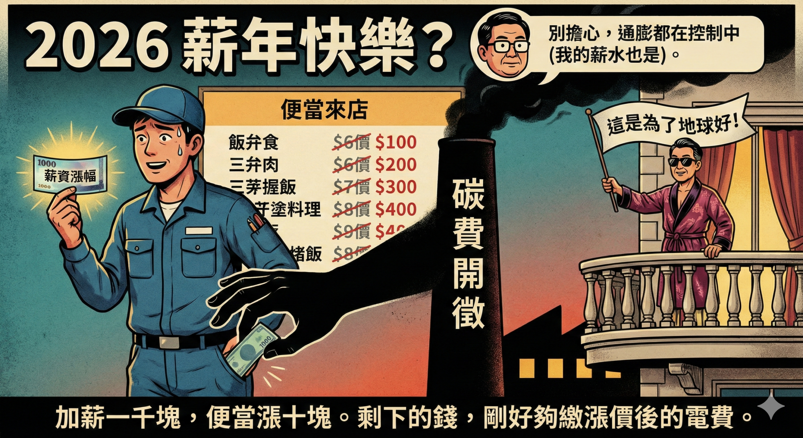 再來談談那感人的 1,000 元加薪。數學老師常說:「魔鬼藏在細節裡。」我幫各位算了一下:一個月吃 60 個便當,每個漲 10 塊,600 元就沒了。剩下的 400 元,你要拿去補勞健保調升的差額,還是要留著繳漲價後的電費?政府請客(調薪),業者收錢(漲價),最後剩下的油膩碗盤(通膨成本),還是得由各位勞工朋友自己洗。