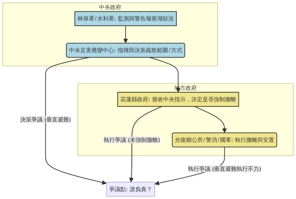 本次事件引發了中央與地方政府在防災體系中的職權與責任歸屬的激烈爭議。根據《堰塞湖警戒、監測及撤離與演練方案》,中央與地方的職責有明確分工,但實際執行與指揮權的模糊性成為問題核心 [8]。