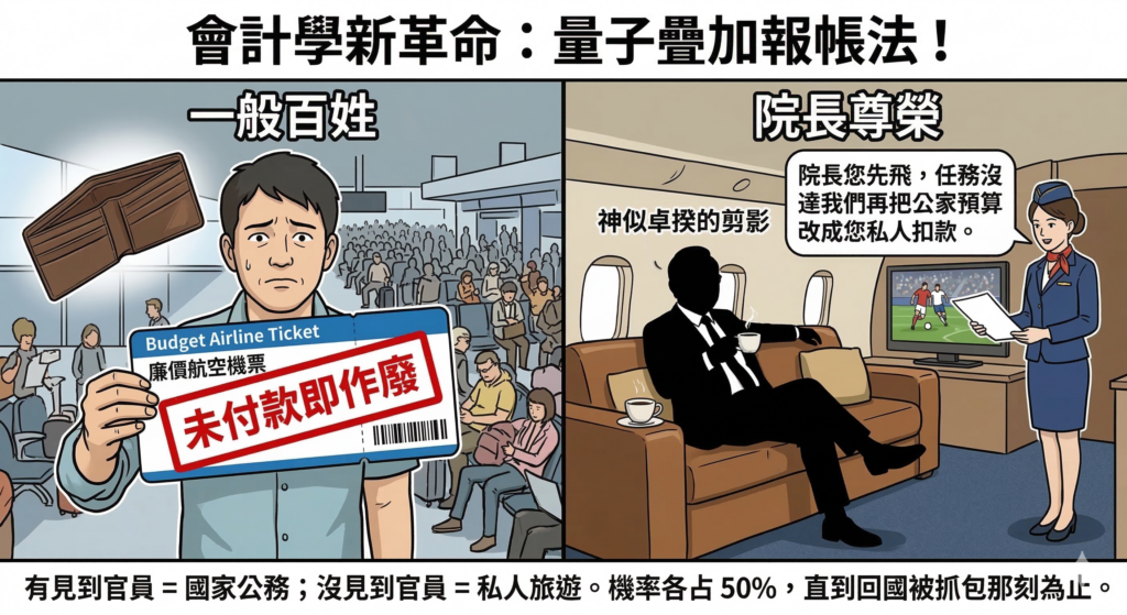 - 公務與私人的「量子疊加」: 到底是去辦公事順便看球,還是看球沒辦成公事?當「公務行程」沒見到日本官員、任務沒達成時,就能瞬間轉化為「私人行程」自費解決。這種「視績效決定性質」的報帳法,堪稱會計學的奇蹟。