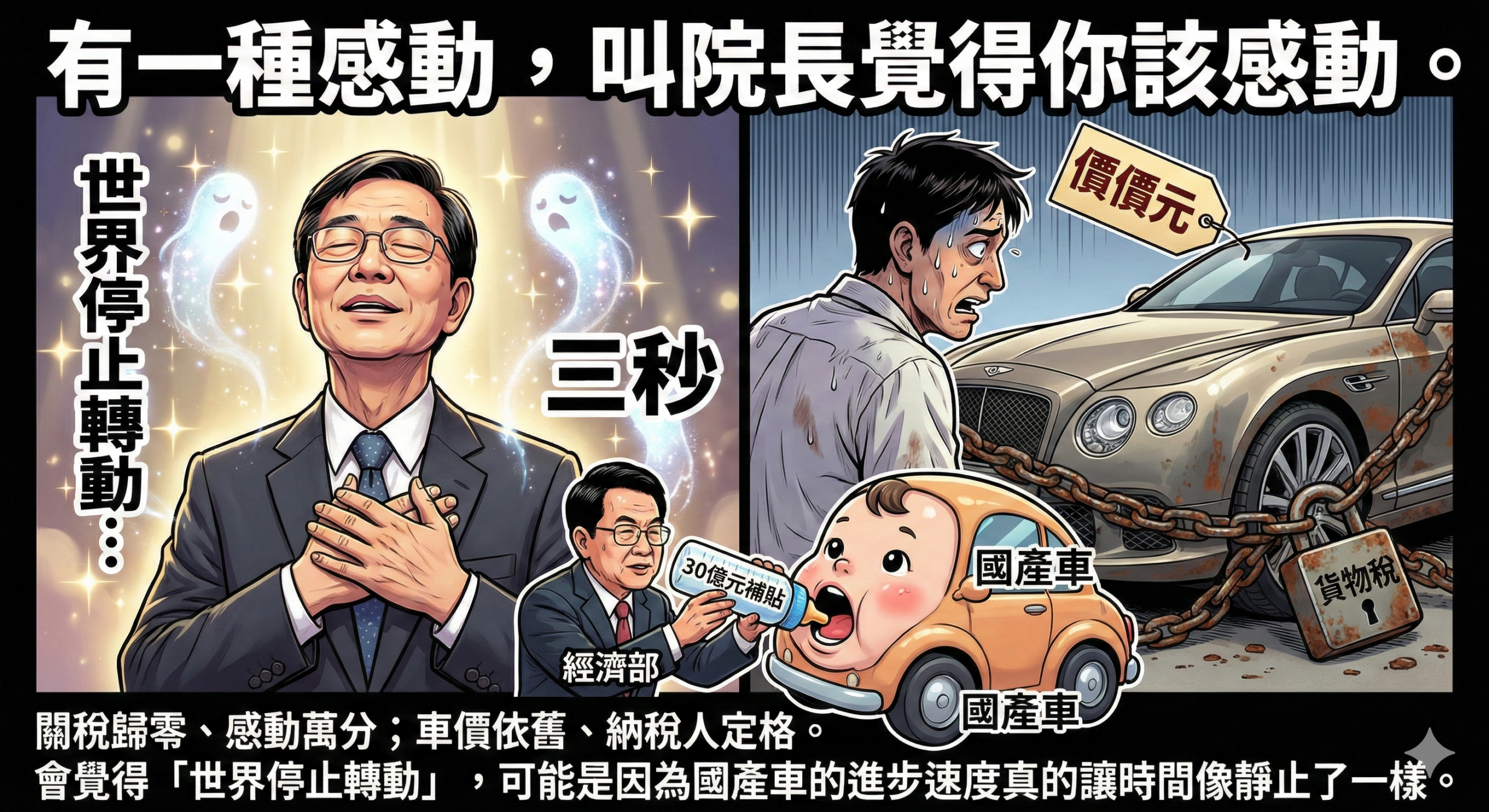 總結來說,這就是一場典型的「情緒溢價」演出。 用極高分貝的情緒語言,去掩蓋產業轉型的無力與政策交換的代價。卓院長,世界真的沒有因為你的感動而停止轉動,反而轉得更快了——那是美國車商磨刀霍霍的聲音,以及國產車業者拿著碗公等補助的叮噹聲。下次如果您真的覺得世界停止轉動,建議先去檢查一下血壓,或是看看存摺裡的30億元發出去沒,那可能比感言更具備醫療效果。