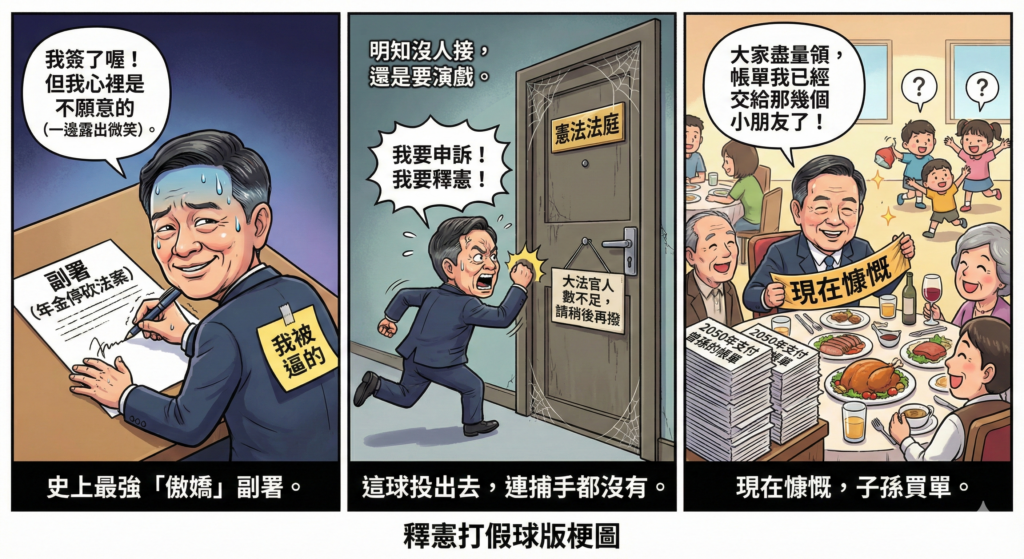 一邊當好人簽字,一邊當受害者告狀,最後受傷的只有國庫。這場「釋憲空手道」大戲,大家記得搬板凳坐好,看看大法官(如果還湊得齊人的話)要怎麼收這攤爛帳!