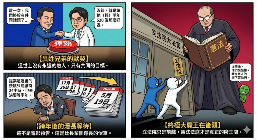 欸,各位觀眾!不用等 2026 跨年煙火了,立法院今天直接送上最強壓軸!🎆 藍白終於破冰啦,不是為了民生,是為了合力把「彈劾」這個大按鈕按下去!