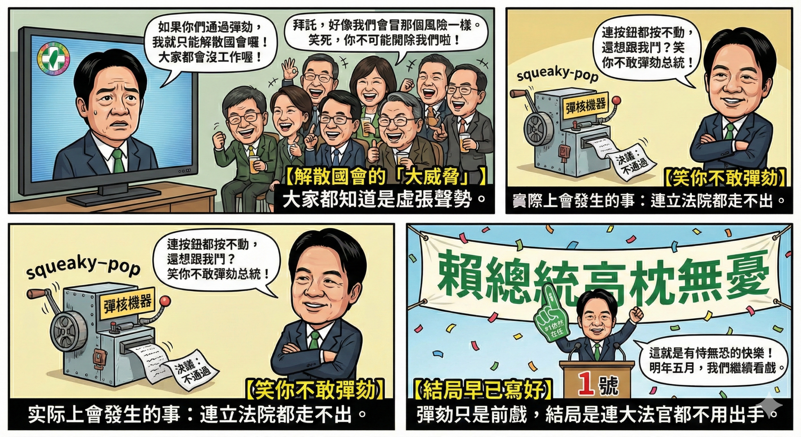聽說,有人在電視上裝出一副「若彈劾通過就解散國會」的嚴肅表情,結果鏡頭一轉,後面的同陣營立委們都笑倒在沙發上。大家都在竊竊私語:「笑死,我們怎麼可能拿自己的飯碗開玩笑?這威脅根本是政治版的狼來了!」