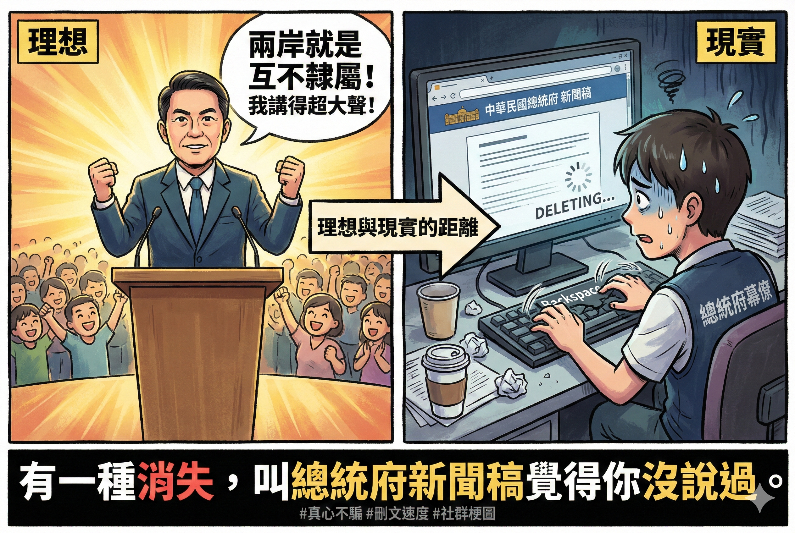 這整件事最荒唐的地方在於:既然敢在公開場合對著全台灣人民、甚至全世界媒體講出來,為什麼在官方紀錄上卻要縮回去? * 誠信問題: 總統的發言代表國家立場,官方新聞稿應是忠實紀錄。隨意刪減,是在質疑全民的聽力,還是在玩「數位消音」?