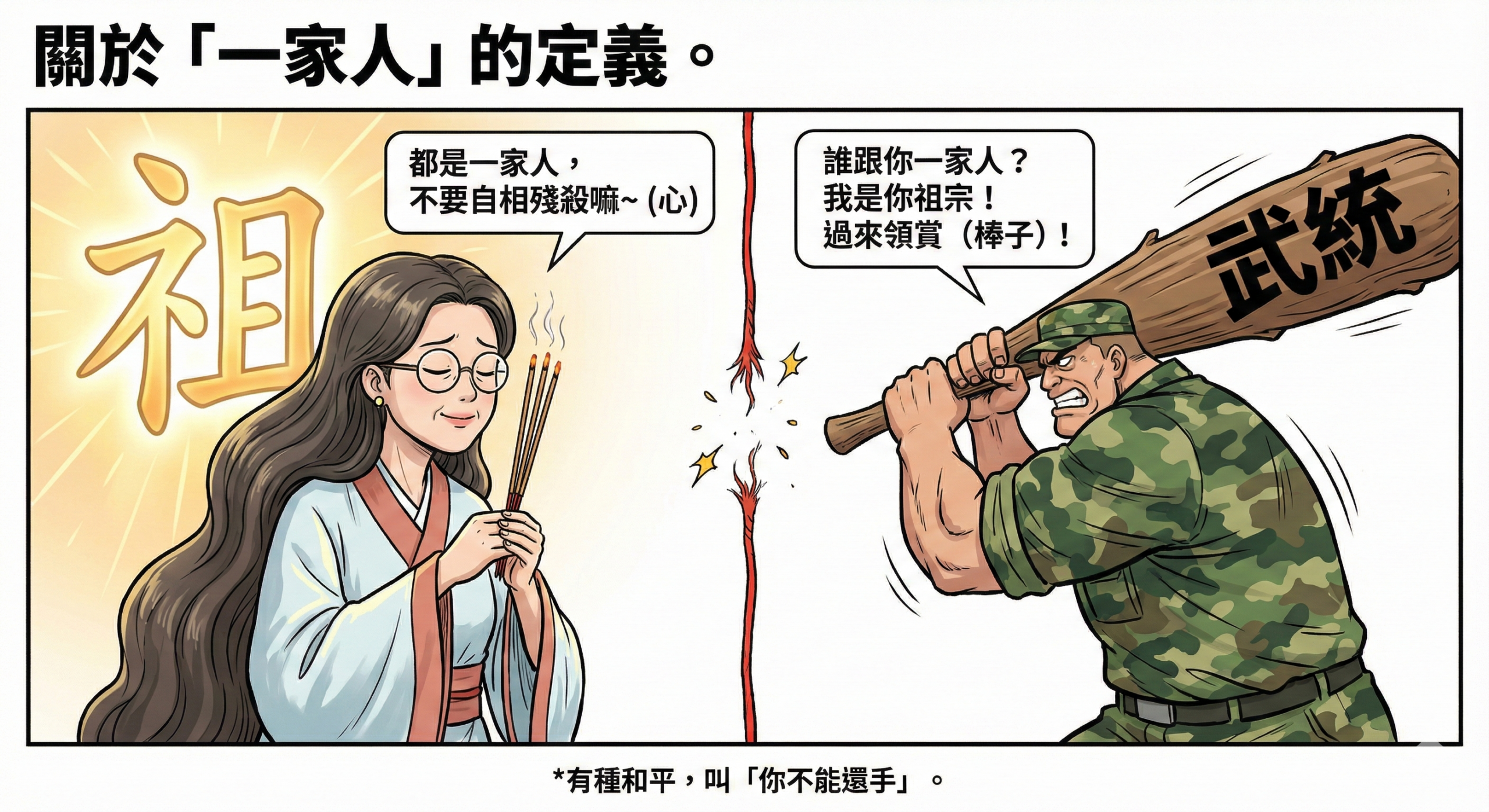 首先,「家人會吵架」這句話是真理,但重點在於「吵完之後是誰要跪在祖先牌位前挨鞭子?」 鄭委員說大家都是中華兒女,不要自相殘殺。這邏輯真的很妙,就像是一個鄰居每天對著你家圍牆潑漆、開著戰車在你門口繞圈,然後某個親戚跑出來說:「哎呀,大家祖宗都姓王,他潑你漆是愛之深責之切,你可千萬別還手,不然就是大逆不道、自相殘殺。」這叫哪門子的和平?這叫**「情緒勒索」**。