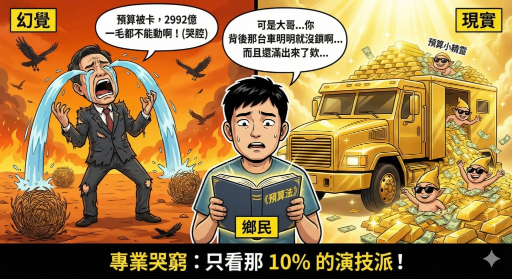一般民眾最卑微的需求,就是希望政府運作正常,該發的補助要發,該做的工程要做。但現實狀況是,政治人物利用民眾對法律細節的不熟悉,刻意放大「預算卡關」的恐懼感。衝突點在於:如果明明有九成的經費可以依法動支,為什麼政府要表現得像是一毛錢都沒有一樣?這種「哭窮」的政治表演,與法律事實存在嚴重衝突。
