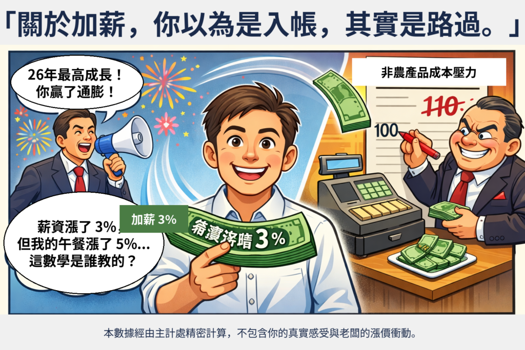 - 薪資漲 3.09%,但你每天都要吃的「外食」漲了 3.39% 以上。這意味著,如果你是個餐餐外食的上班族,你的加薪根本沒入庫,直接被轉交給了麵店老闆。